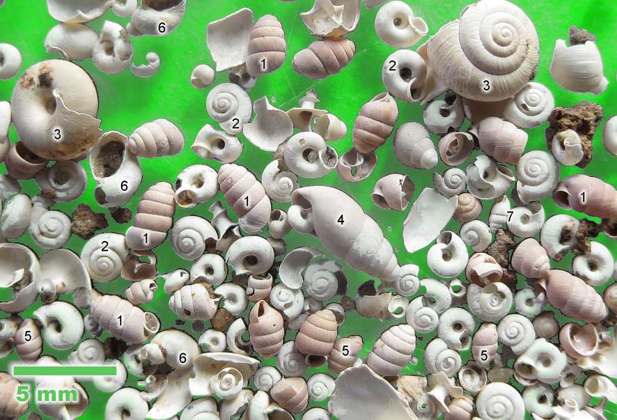 Eisenzeitliche Molluskenfauna aus Dettenheim, Stadt Weißenburg in Bayern, Landkreis Weißenburg-Gunzenhausen (Pupilla muscorum (1), Vallonia pulchella (2), Trichia “hispida-plebeia” (3), Cochlicopa lubrica (4), Vertigo pygmaea (5), Succinea oblonga (6) u. Carychium minimum (7))