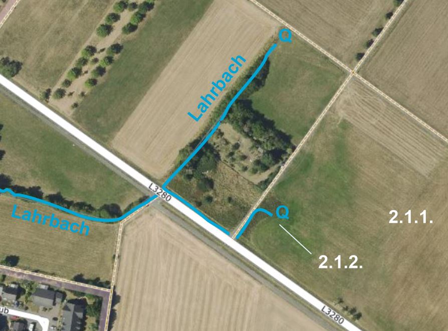 Wie der Blick auf das Luftbild (s. oben 2.1.1.) zeigt, ist die vorliegende Helokrene als eine der Quellen des 'Lahrbach' zu betrachten; das austretende Quellgerinne wird zunächst im tiefen Wegseitengraben zur L3280 umgeleitet und dort in den (leider meist vermüllten) Straßengraben gezwängt. Bei K 50.521553, 8.100878 mündet es in den aus NO kommenden Lahrbach und wird schließlich unter der L3280 hindurch geleitet.