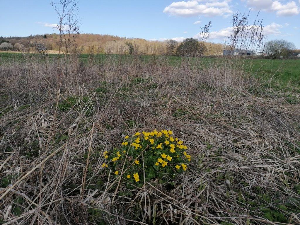 Blick von der großen Versumpfungs-Quelle nach O Richtung Waldbrunn-Fussingen und das wachsende Gewerbegebiet (rechts). Die Entnahme-Stelle der Wasser- und Sediment-Probe (Tabelle 1) liegt unmittelbar vor der Sumpfdotterblume (Caltha palustris L.); (Foto: HR 19.04.2023)