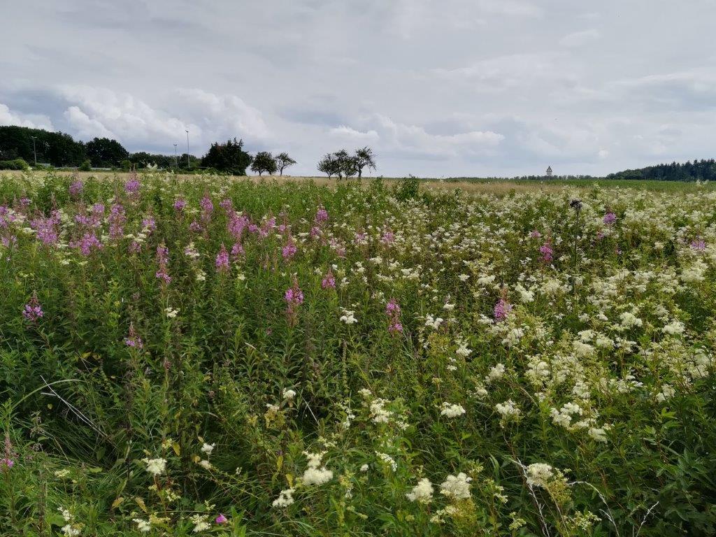 Inzwischen ein Anblick mit Seltenheitswert: extensiv genutztes Grünland im Wanderkorridor im Osten von Waldbrunn-Hausen; Blick n. SO auf den Kunstrasen-Sportplatz und Teile des wachsenden Gewerbegebietes (links); (Foto: HR 13.07.2021)
