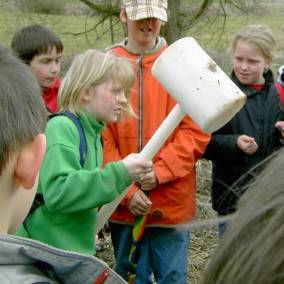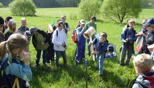 Weilburger Tagblatt, 15.06.2007: Wie der Wald zum Museum wird Holger Rittweger hat ein Maßband auf dem Schulhof der Grundschule Hausen ausgerollt. Ein Meter soll 1000 Jahre darstellen. "Was meint ihr, wo Manni hingehört?", fragt Rittweger die Schüler und hält die Figur eines Mammuts in die Höhe.Die Antwort: In zwölf Meter Entfernung - und damit 12 000 Jahre vor unserer Zeit. Die Geschichte der Erde anschaulich darzustellen - das hat sich der promovierte Geowissenschaftler aus Waldbrunn zur Aufgabe gemacht. Rittweger betreibt ein privates Museum, das "Mobile Landschaftsmuseum". Und damit ist der 45-Jährige in ganz Deutschland unterwegs. Um die Dinosaurier in der Erdgeschichte zu verorten, reicht Rittwegers Maßband nicht aus. "Die Dinosaurier müssten wir 65 Kilometer weit weg aufstellen - also etwa in der Frankfurter Innenstadt", erklärt Rittweger den 32 Viertklässlern der Grundschulen Hausen und Lahr. Gemeinsam unternehmen sie an diesem Tag eine "Geo-Exkursion in die Erdgeschichte". Und dieser Ausflug führt sie - in den heimischen Wald. "Wir arbeiten immer im vierten Schuljahr mit dem Mobilen Landschaftsmuseum zusammen", sagt Lehrerin Hedi Krämer. Zwei Tage ist Rittweger dann bei den Grundschülern zu Gast. Die zweite Veranstaltung befasst sich mit der Steinzeit - die Kinder können dann unter anderem ausprobieren, wie sich ohne Feuerzeug oder Streichhölzer ein Feuer entzünden lässt. Anschaulich sind die Mittel, mit denen Rittweger arbeitet. "Es gibt viele Museen. Aber um jemanden für diese Themen zu interessieren, muss man Dinge zum Anfassen bieten." Rittweger, der bis vor wenigen Jahren ausschließlich wissenschaftliche arbeitete, ist deshalb auf die Idee gekommen, das "Mobile Landschaftsmuseum " zu gründen. "Draußen im Gelände gibt es überall etwas zu zeigen." Rittweger führt die Museumsbesucher also dorthin, wo Erdgeschichte sichtbar wird. Die Asche eines Vulkans, der vor 10 900 Jahren explodierte, liegt im Wald. Für die Grundschüler ist das heute unter anderem der Steinbruch in Hausen. Dort gibt es Säulenbasalt zu sehen. "Ein Vulkan hat dieses Gestein einmal ausgespuckt", erklärt ihnen der Wissenschaftler. Weiter geht es zum Adler-Felsen. Dort hat sich der Basalt in Schichten abgelagert. Um den Felsen, der auch "Wildweiber-Kirch" genannt wird, ranken sich Geschichten. Dunkle Gestalten mit zerzausten, schwarzen Haaren sollen hier gehaust haben. An anderer Stelle entnehmen die Schüler gemeinsam mit Rittweger eine Bodenprobe - und stoßen in ein bis zwei Meter Tiefe auf so genannten Waldsand. "Das ist nichts anderes als Vulkanasche. Vor 10 900 Jahren ist in der Eifel ein Vulkan explodiert - und die Asche gelangte bis zu uns." Nicht nur für Schulklassen, sondern auch für Kindergartengruppen oder Volkshochschulen bietet der 45-Jährige Exkursionen mit seinem "Mobilen Landschaftsmuseum" an. Wenn er nicht Gruppen durch die Landschaft führt, arbeitet Rittweger nach wie vor wissenschaftlich - zum Beispiel für die Landesdenkmalpflege. Er untersuche unter anderem Ablagerungen in Seen und Mooren oder eiszeitliche Schnecken und Muscheln. "Damit lässt sich die Landschaftsgeschichte rekonstruieren." Nebenbei ist er ehrenamtlich tätig - als Bodendenkmalpfleger für den Landkreis. Heute ist Rittweger allerdings der Direktor seines eigenen Museums. "Die meiste Arbeit liegt in der Vorbereitung", sagt der 45-Jährige. Exponate müssten gepflegt, das Material zusammengestellt werden. Ehrenamtlich sei das nicht zu leisten - für einen Ausflug mit dem "Mobilen Landschaftsmuseum" muss deshalb auch etwas bezahlt werden. Nach drei Stunden beenden die Schüler ihren Ausflug durch die Erdgeschichte. Das nächste Mal geht es in die Steinzeit. Weitere Informationen gibt es unter www.mobileslandschaftsmuseum.de.
