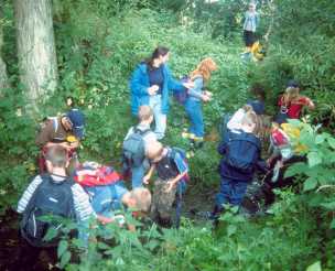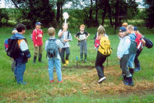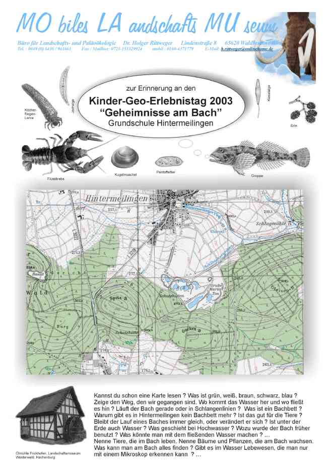 Der nachfolgende Beitrag erschien am 18.10.2003 in den Waldbrunner Nachrichten: Geo-Erlebnis-Tag "Geheimnisse am Bach" Der nachfolgende Bericht wurde unverändert (d.h. auch mit allen orthographischen "Besonderheiten") nach Aufsätzen von den Schülerinnen und Schülern René Arnold, René Buschong, Jannik Eckert, Fabian Eich, Benedikt Gröschen, Daniel Hartung, Jörn Höhler, Janine Klüter, Laura Mons, Jan-Niclas Rudersdorf, Louisa Schäfer, Philipp Schmitt, Christian Seidel und Regina Stiben zusammengestellt: "Am Dienstag, den 01.07.03 trafen wir uns um 8 Uhr in der Grundschule Hintermeilingen. Als wir alle da waren hat der Herr Ritweger uns ein paar Dinge über unseren Fluss erzählt und warum der Fluss nicht so wie andere Flüsse war. Nach einer Weile gingen wir los, zuerst haben wir den Fluss beobachtet. Dort hat uns Herr Rittweger alles über das Leben im Bach erzählt. Zum Beispiel: Welche Tiere es im Bach gibt und warum die Tiere aus dem Bach nicht mehr durch Hintermeilingen schwimmen könen. Dann sind wir an einen kleinen Teich gegangen. Da haben wir Schlammschnecken gefangen und wieder frei gelassen. Dort haben wir auch eine kleine Pause gemacht. Als wir alle fertig waren sind wir an den Fluss zurückgekehrt. Der Mann, der uns das alles zeigte, hatte uns erlaubt mit den Stiefeln in den Bach zu gehen. Da waren ganz viele kleine Tiere z.B. Blutegel, Wasserschnecken, schwarze Wasserkäfer. Mit einem Kärcher und einem Pinsel fingen wir ganz viele Tiere. Die Tiere, die an den Steinen hingen machten wir mit dem Pinsel ab und steckten sie in ein Wassergefäß. Die Tiere im Bach ernähren sich von Wasser, Moos, Holz und anderen kleinen lebewesen. Ich habe vier Tiere gefangen. Einen Blutekel, einen Minikrebs, eine Larve und ein Flohkrebs. Als wir dann an dem Bach fertig wahren, gingen wir zurück in die Schule. Auf dem Weg dort hin lernten wir viele Pflanzen kennen. Als wir dann in der Schule wahren baute Herr Rittweger die Mikroskope auf und wir konnten dadurch das was wir gesamelt hatten sehen. Unter dem normalen Mikroskop haben wir alles nur vergrößert gesehen. Aber unter dem Lichtmikroskop konnten wir sogar bei einem Grasstück die Bakterien sehen. Mir persönlich hat das Tiere fangen am besten gefallen. Leider mussten wir die Tiere am Nachmittag wieder frei lassen. Es hatte uns sehr viel Spaß gemacht. Am besten haben mir die Bohrungen gefallen." s. auch: >>> Subfossile Pflanzenreste in Torfschichten am Hintermeilinger Floß ...