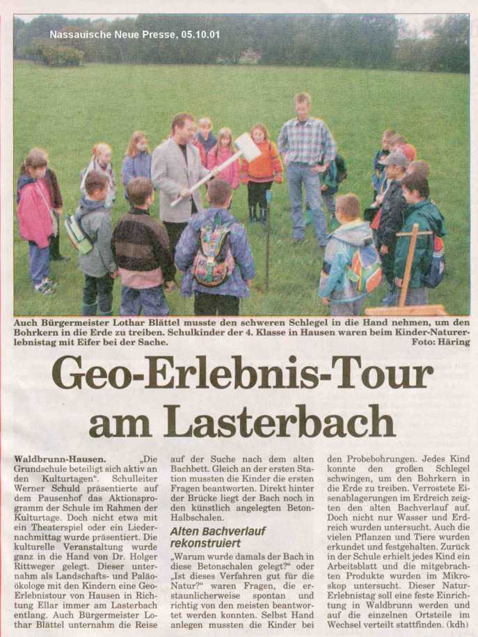 Erdkunde aktiv: Kultur - Natur - Landschaft "Geo-Erlebnis-Tour am Lasterbach" Ein Projekt der Grundschule Hausen und des MObilen LAndschafts MUseums im Rahmen der Kinder-Kulturtage 2001 in Waldbrunn-Hausen