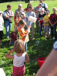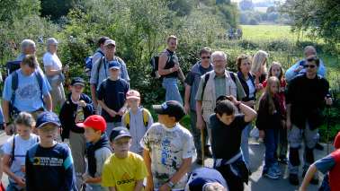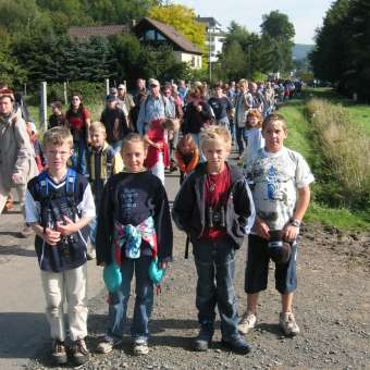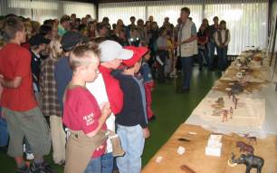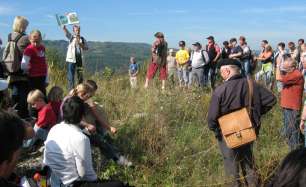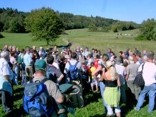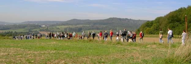 Waldbrunn-Hausen. Mit solch einer Begeisterung hatten die Mitglieder der Kreisheimatstelle, mit ihrem Pressesprecher Bernd Kexel und Dr. Holger Rittweger, bei der Geo-Erlebnis-Exkursion "70 Millionen Jahre zu Fuß" nicht gerechnet. Über 135 Frauen und Männer aus dem gesamten Kreisgebiet trugen sich in die Teilnehmerliste zu dieser Wanderung durch die Geschichte ein. In einer Ausstellung in der Mehrzweckhalle Hausen, dem Ausgangspunkt der acht Kilometer langen Exkursion, hatte Dr. Rittweger die Zeitspanne vom Aussterben der Dinosaurier bis zum Auftreten der ersten Menschen in unserer Region lebendig werden lassen. Zahlreiche Exponate wie Fossilien, Darstellungen von vorzeitlichen Lebewesen, Faustkeile, Feuersteine und einfachen Waffen begeisterten Groß und Klein. Schon hier waren die vielen Erwachsenen und die 50 Kinder und Jugendlichen mit Fragen und Interesse bei der Sache. Auf die brennendste Frage "Gab es hier Dinosaurier?" hatte auch Dr. Rittweger eine Antwort. Spuren der Saurier wurden z.B. im Sauerland und in Niedersachsen gefunden. Doch auch in unseren Breiten lassen sich Spuren von vielen früheren Lebewesen finden. Darunter die berühmte Stöffel-Maus, die in Nistertal-Enspel gefunden wurde. Nach der ausführlichen Einführung in der Hausener Mehrzweckhalle ging es auf den Weg 70 Millionen Jahre zurück in die Geschichte. Schier endlos war die "Karawane" von über 135 geologisch Interessierten, darunter erfreulich viele Familien mit zahlreichen Kindern, die sich auf die Reise durch 70 Millionen Jahre gemacht hatten. Die Teilnehmer zeigten sich auf diesem Weg begeistert von der kurzweiligen, lebendigen Darstellung der Entwicklung von Landschaft und Leben der heimischen Region durch Dr. Holger Rittweger. So wurde auf den vielen Stationen immer wieder ein Schritt von mehreren Millionen Jahren nach vorne getätigt. Darunter Stationen wie "Die Dinos und die Bombe aus dem All" (55000000 Jahre), "Als die Pferde so groß wie Rehkitze waren" (45000000 Jahre) oder "Beginn der letzten Eiszeit" (100000 Jahre). Verwundert waren von allem die Kinder über die Information, dass in unseren Breiten vor der Eiszeit einst ein tropisches Klima herrschte und in den damaligen Seen Krokodile und Amphibien lebten. Anschaulich auch die Informationen, wie Basalt und Ton in unsere Breiten kamen. Dazu passend die Mittagspause "auf dem Vulkan". Erzählt wurde von den gewaltigen Vulkanexplosionen und von der Steppenlandschaft in der Eiszeit. "Nach den letzten Veranstaltungen wie "Kegelkarst in Runkel-Hofen", der Fahrradtour an der Lahn zur Geschichte der Schifffahrt und der Eisenbahngeschichte, dem Steinkistengrab in Niederzeuzheim und der Exkursion "70 Millionen Jahre zu Fuß" werden bestimmt noch weitere Folgen", so der Sprecher der Kreisheimatstelle Bernd Kexel. (kdh) |