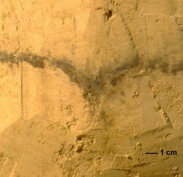 erkennenden, mit dunklerem Material gefüllten Nagergänge (sog.