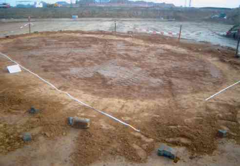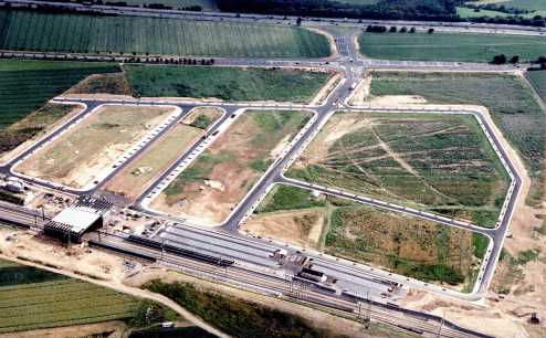 Das ICE-Gelände aus der Luft. Im östlichen Teil (links) sind zwischen den Straßentrassen zahlreiche durch Planen abgedeckte, bislang noch nicht dokumentierte archäologische Befunde sowie die Grabungshütte zu erkennen (vgl. Übersichtsplan [unten]; Photo: Sascha Braun, 2002).