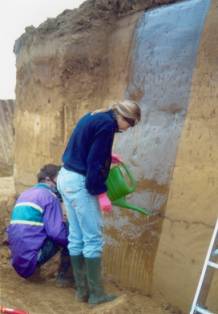 Neben der Keramik geben auch die übrigen menschlichen Hinterlassenschaften (Artefakte), z.B. Werkzeuge aus Knochen oder Stein, Auskunft über das Alter und die Nutzung der Gruben. Anhand moderner Analysemethoden lassen sich aus den Grubenfüllungen jedoch noch sehr viel weitergehende Informationen gewinnen, als gemeinhin bekannt ist. Mittels bodenchemischer Analysen kann z.B. die Anreicherung bestimmter Stoffe nachgewiesen werden. Die Tierknochen erlauben Rückschlüsse auf die frühe Haustierhaltung sowie den Umfang und die Methoden der Jagd. Eine Informationsquelle der besonderen Art stellen daneben die verkohlten Pflanzenreste dar: Durch die Radio-Kohlenstoffdatierung der enthaltenen Holzkohlen kann z.B. das Alter der Grubenbefunde relativ genau ermittelt werden. Mit den Methoden der Archäobotanik können zudem die verwendeten Holzarten bestimmt werden. Die verkohlten Samen und Früchte geben darüber hinaus Auskunft über die Art und Technik des Ackerbaus sowie die verwendeten Nutzpflanzen und erlauben z. T. sogar, das Bild der damaligen Landschaft in Grundzügen zu rekonstruieren. Es handelt sich demnach nicht um Dreck, wie mancher Zeitgenosse meinen mag, sondern um eine sehr bedeutende und auch die einzige (!) Informationsquelle für die Geschichte unserer frühen Landwirtschaft, weshalb gerade die auf bäuerlichen Traditionen fußende Landbevölkerung ein besonderes Interesse an einer Auswertung haben sollte. Um diese wichtigen Archive für zukünftige Untersuchungen zu sichern, wurden deshalb aus fast allen Grubenfüllungen Bodenproben für eine spätere Bearbeitung entnommen. |