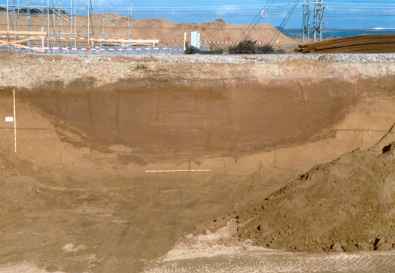 Archäologie am ICE-Bahnhof Limburg. Links: Befund 14, Profil 1 u. Planum 1: Sehr schmale und tief reichende Schlitzgrube mit leicht abgerundeten Enden. Bislang konnten mehr als 10 dieser bemerkenswerten Bodendenkmäler auf engstem Raum dokumentiert werden; Mitte: Befund 5, Planum 1.: Die mit dunklem Oberbodenmaterial gefüllte Grube (doppelte Pfostengrube) zeichnet im horizontalen Anschnitt (Planum) die Form einer liegenden Acht nach; rechts: Befund 5, Profil 1.: Im vertikalen Anschnitt (Profil) ist zu erkennen, dass es sich bei Befund 5 (vgl. Abb. oben) um eine tief reichende Doppel- Pfostensetzung handelt, die im unteren Bereich den Eltviller Tuff schneidet. Nach dem Verfaulen des Holzes, floss das schwarzbraune Oberbodenmaterial in die künstlich entstandene Hohlform; (Fotos H. Rittweger, 2001) |