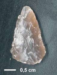 Archäologie am ICE-Bahnhof Limburg. Links: Befund 4.: Vorgeschichtliche Keramik mit grober Milchquarz-Magerung, die mit einiger Wahrscheinlichkeit in das Jung- bis Endneolithikum einzuordnen ist; Mitte: Befund 15, Planum 1.: annähernd kreisrunde, sich nach unten glockenförmig erweiternde Grube mit (von rechts) "einmündender" Schlitzgrube. Die Funktion dieser außergewöhnlichen und nach der Bodenentwicklung alten (wahrscheinlich jungsteinzeitlichen) Grube ist bislang unbekannt; Rechts: Jungsteinzeitliche Pfeilspitze aus nordischem Feuerstein; (Fotos H. Rittweger, 2001) |