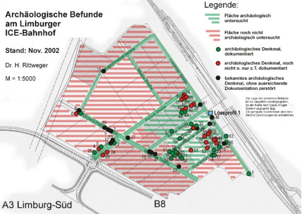 Nachtrag, 13.04.2010: Für weitere teils bemerkenswerte Informationen und Befunde sei auf die Grabungsberichte: RITTWEGER, H. (2006 a): Archäologische Baubegleitung: Dienstleistungszentrum am ICE-Bahnhof Limburg; Kampagnen 2001-2002 - unveröff. Grabungsbericht / Fach-Gutachten (77 Seiten; incl. 175 Dia-Postive u. 45 DIN-A-3-Bögen m. farbigen Befundzeichnungen) i.A. d. Landesamt f. Denkmalpflege Hessen, Wiesbaden. RITTWEGER, H. (2006 b): Archäologische Baubegleitung Limburg ICE-Bahnhof (Dokumentation von Bodendenkmälern im Bereich "Business-Tower") - Grabungsbericht / Fach-Gutachten i.A. Landesamt f. Denkmalpflege Wiesbaden. RITTWEGER, H. (2006 c): Archäologische Baubegleitung Limburg ICE-Bahnhof (Dokumentation von Bodendenkmälern im Bereich "Amt für Bodenmanagement") - Grabungsbericht / Fach-Gutachten i.A. d. Magistrats der Stadt Limburg. hingewiesen, die dem Landesamt für Denkmalpflege Hessen und der Stadt Limburg vorliegen. Daneben stehen sie hier auch zum Download (PDF-Dateien inkl. Fotos und Befundzeichnungen) zur Verfügung: >>> Grabungsbericht LM-ICE Dienstleistungszentrum 2001-2002 >>> Grabungsbericht LM-ICE Amt für Bodenmanagement 2006 >>> Grabungsbericht LM ICE-Businesstower 2006